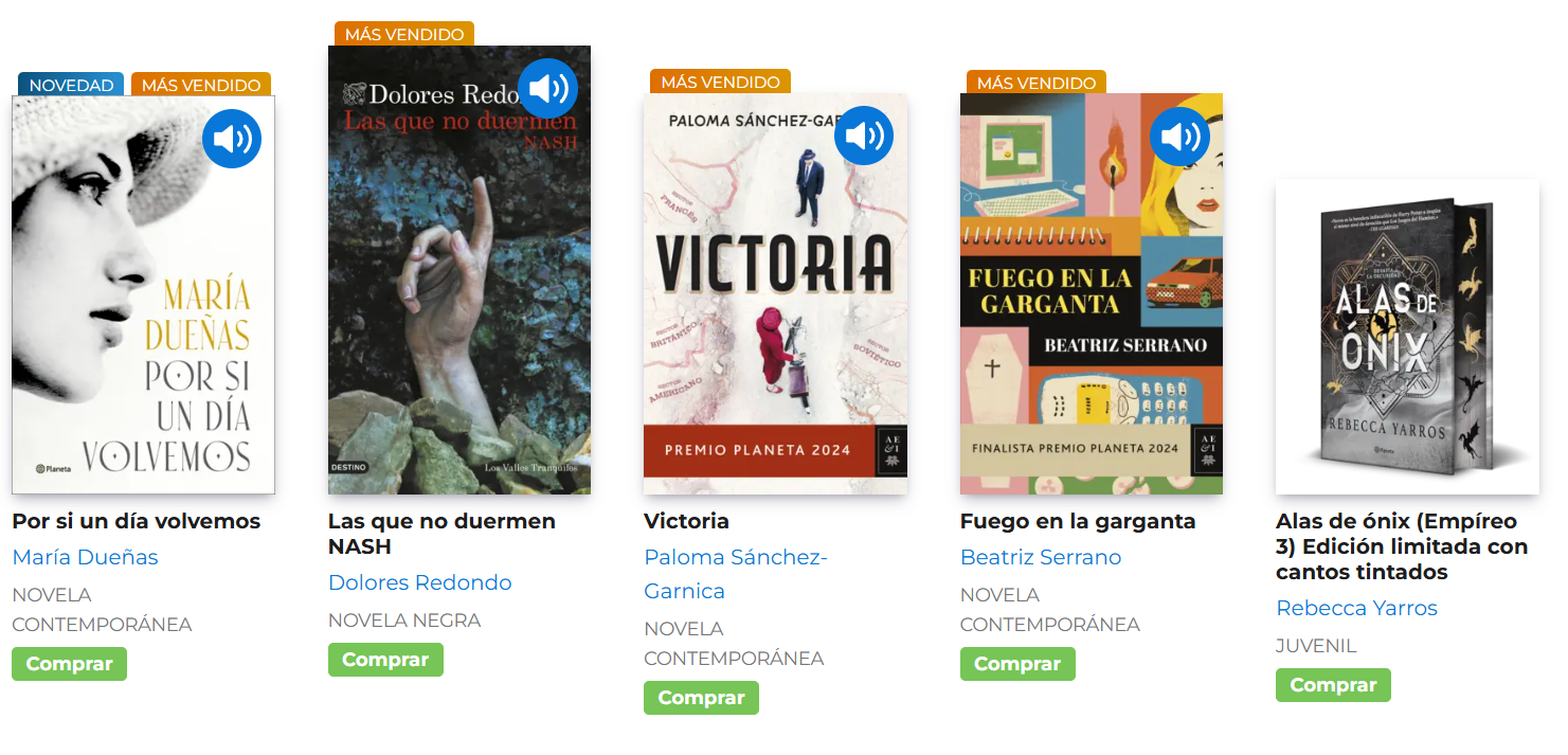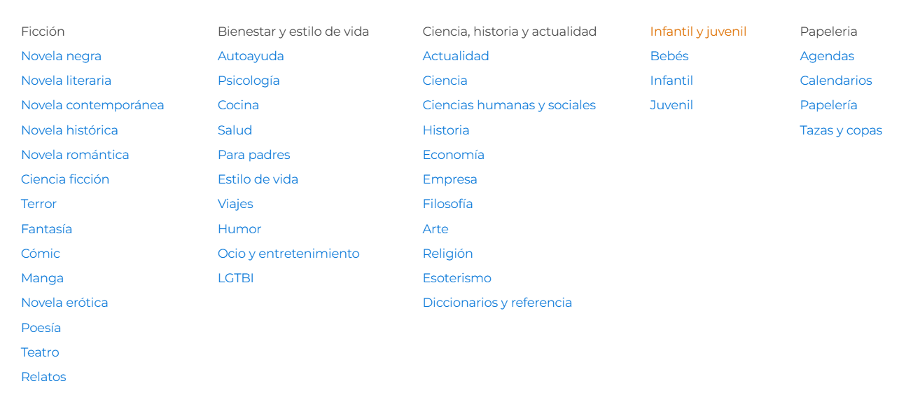 Ficción: Novela negra, Novela literaria, Novela contemporánea, Novela histórica, Novela romántica, Ciencia ficción, Terror, Fantasía, Cómico, Manga, Novela erótica, Poesía, Teatro, Relatos.